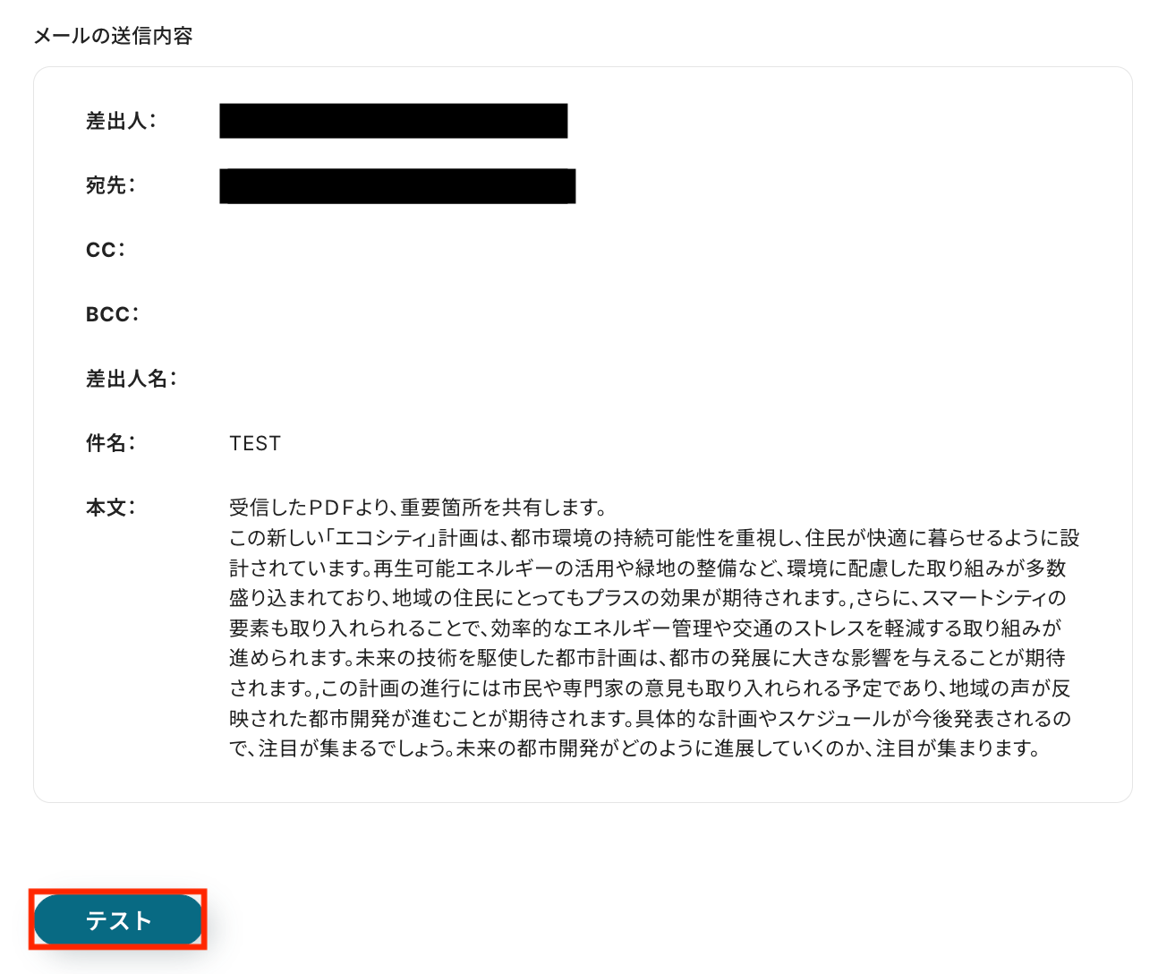 ※テストを押すと実際にメールが送信されるので、注意してください。