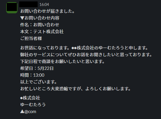 5.Slackの画面に移動し、実際にテスト用のメッセージを送信してください。