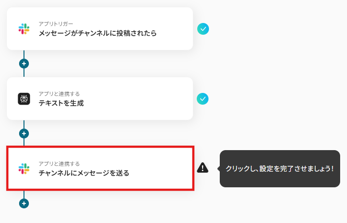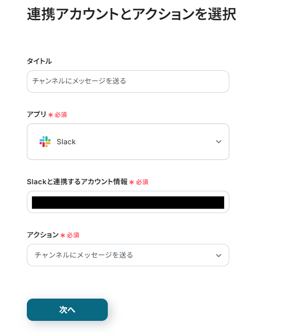 先ほどと同様にタイトルと連携するアカウント情報を任意で設定し、アクションはテンプレート通りに「チャンネルにメッセージを送る」のまま「次へ」をクリックして進んでください。