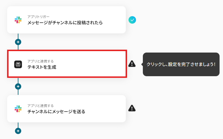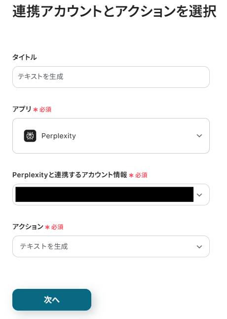 先ほどと同様にタイトルと連携するアカウント情報を任意で設定し、アクションはテンプレート通りに「テキストを生成」のまま下にスクロールします。