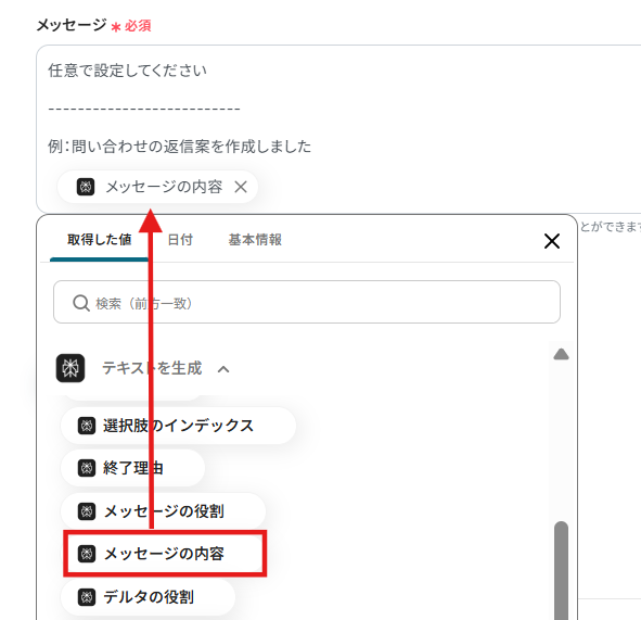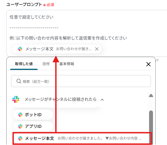 ・ユーザープロンプト:元から設定されています。編集欄をクリックすると、Slackで取得した情報を引用できます。
