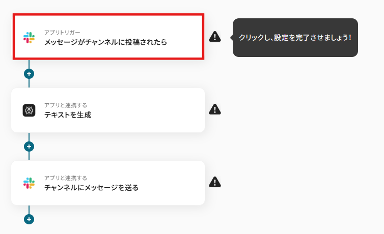 タイトルと連携するアカウント情報を任意で設定し、トリガーアクションはテンプレート通りに「メッセージがチャンネルに投稿されたら」のまま「次へ」をクリックして進んでください。