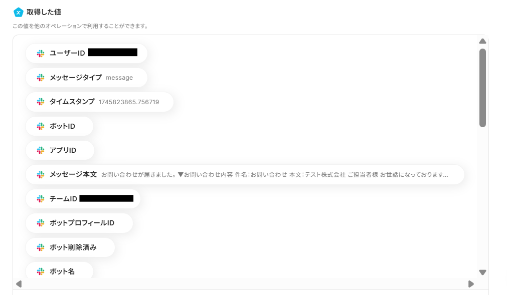 6.設定後、「テスト」をクリックしてください。テストが成功した場合は、アウトプットが取得できます。