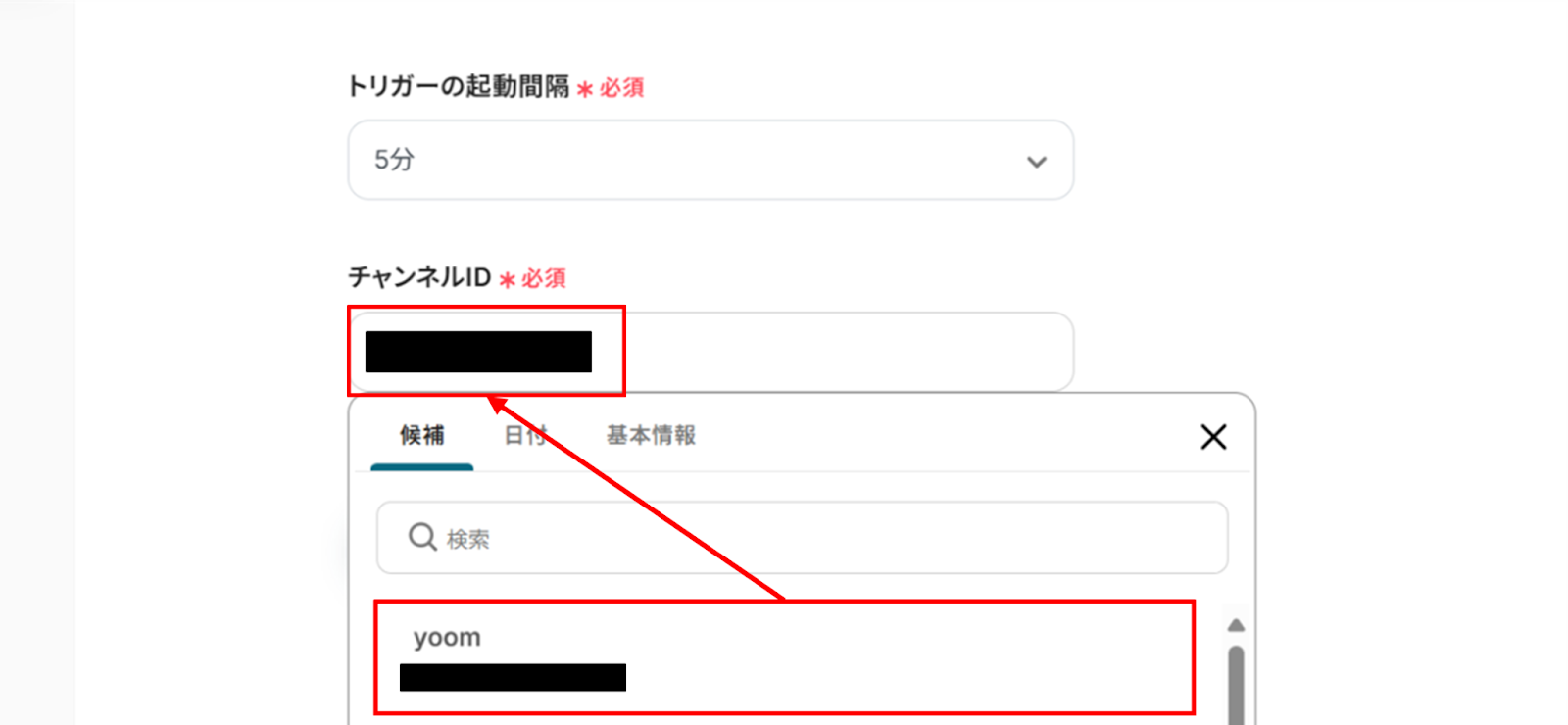 下へ進み、チャンネルIDを候補から選択します。 Yoomに戻り「テスト」をクリックしましょう。