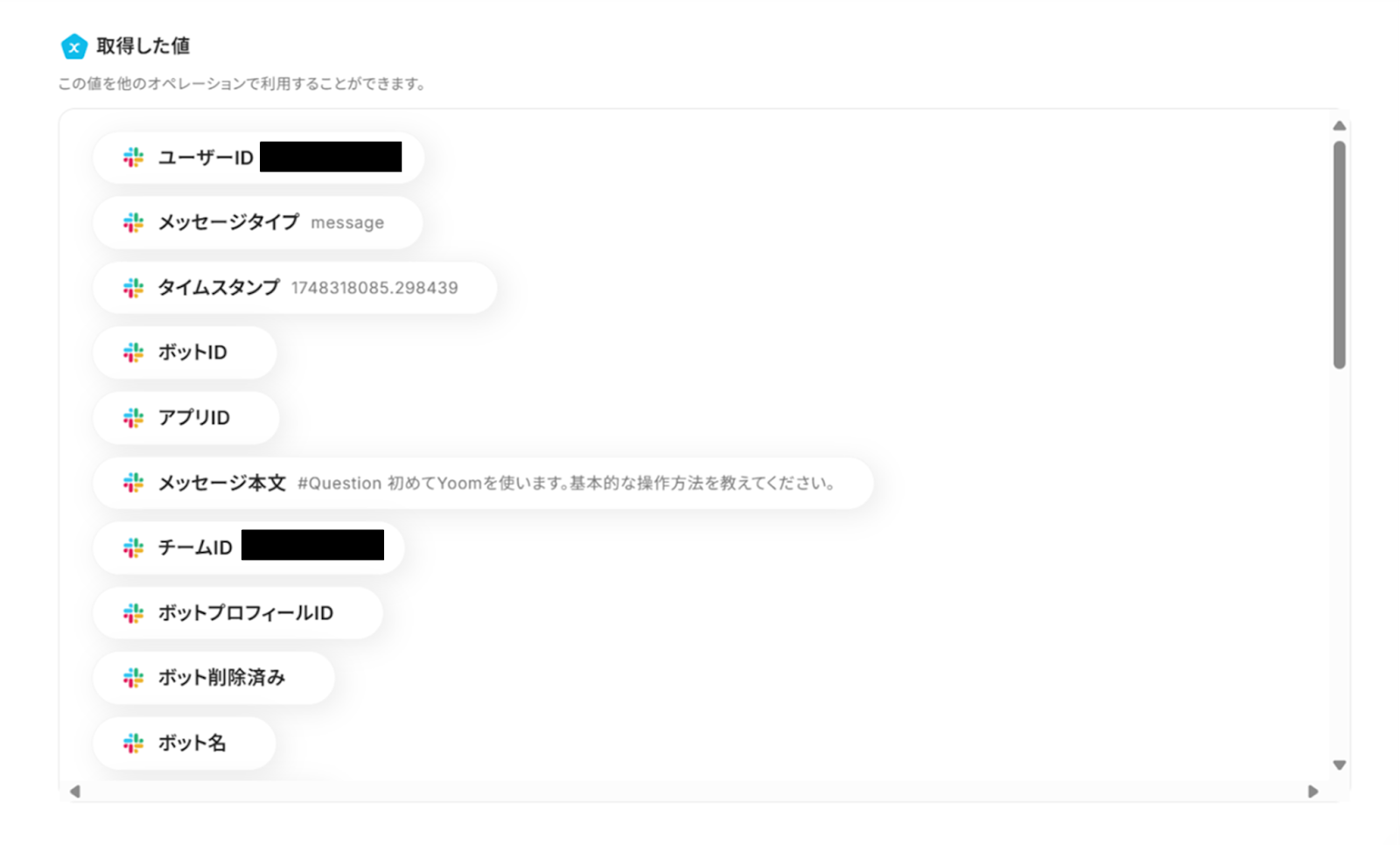 Slackの情報が「取得した値」に反映されればテスト成功です。 「取得した値ってなんだろう?」と思った方は下のサイトをご参照ください!