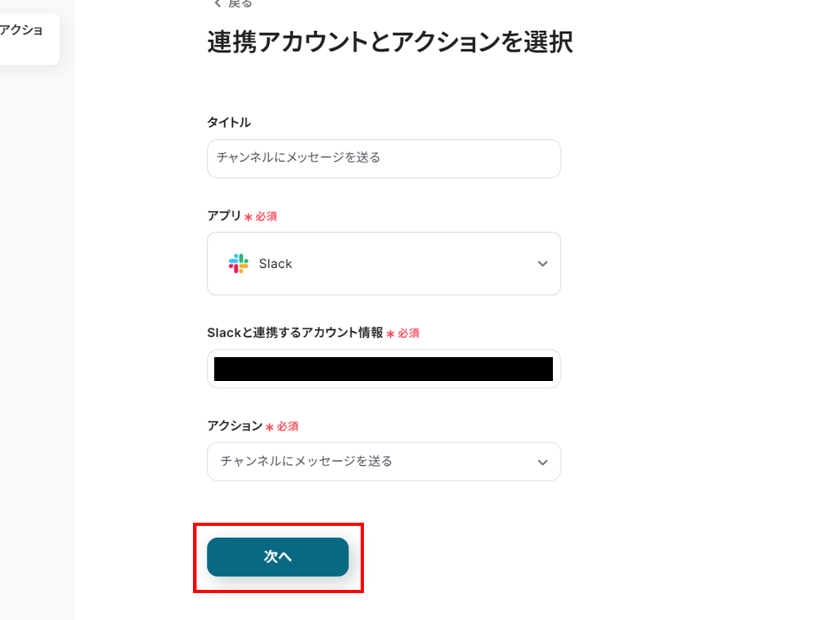 (2)Slackの「連携アカウントとアクションを選択」画面から、Slackと連携するアカウント情報に誤りがないかを確認し、アクションは「チャンネルにメッセージを送る」のままで「次へ」をクリックします。