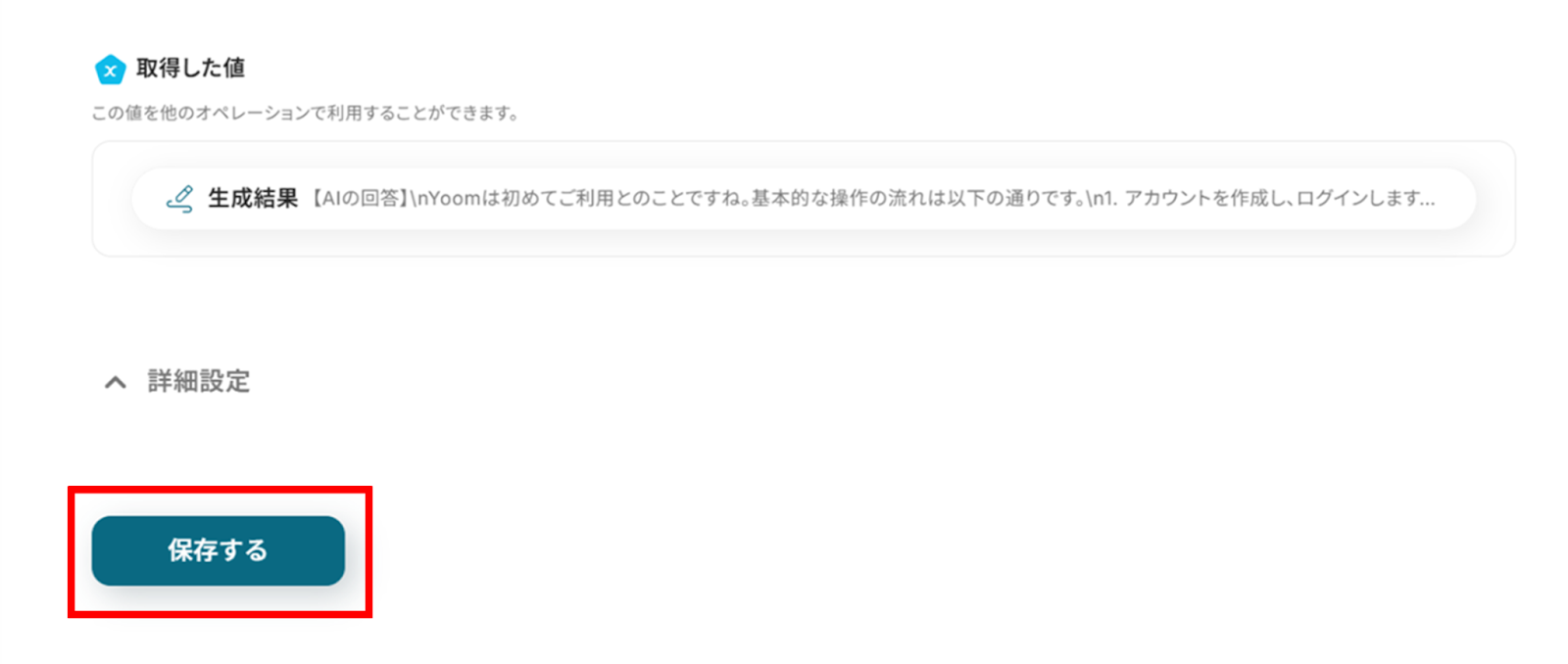 テストに成功すると、取得した値に生成結果が追加されました! この値は次の工程で使用します。 「保存する」をクリックして次の工程へ進みましょう!