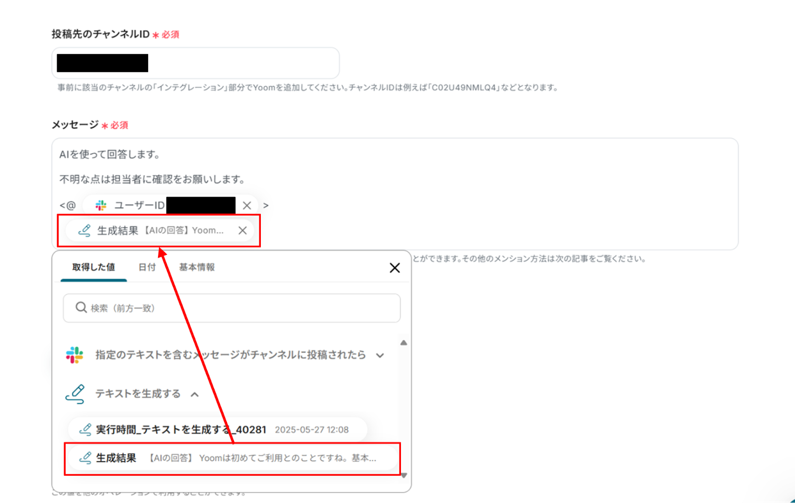 (3)「API接続設定」画面から、投稿先のチャンネルIDを候補から選択します。 メッセージに入力した内容がSlackに送信されます。先ほど取得した「生成結果」を文中に入力しましょう。 また、下の画像のように「ユーザーID」を入れることで質問者宛てにメンションをつけることができます。