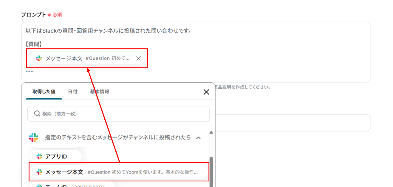(3)「詳細を設定」画面から、プロンプトにAIへの指示内容を入力します。 文中に取得した値を使って「メッセージ本文」を入力しましょう。 取得した値を使うことで、都度変更することなくSlackの情報が自動で反映されます!