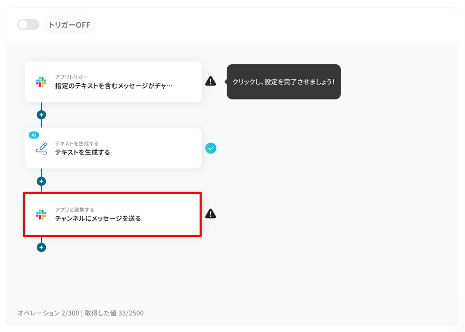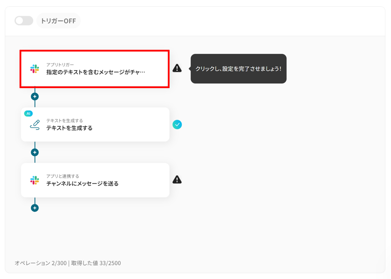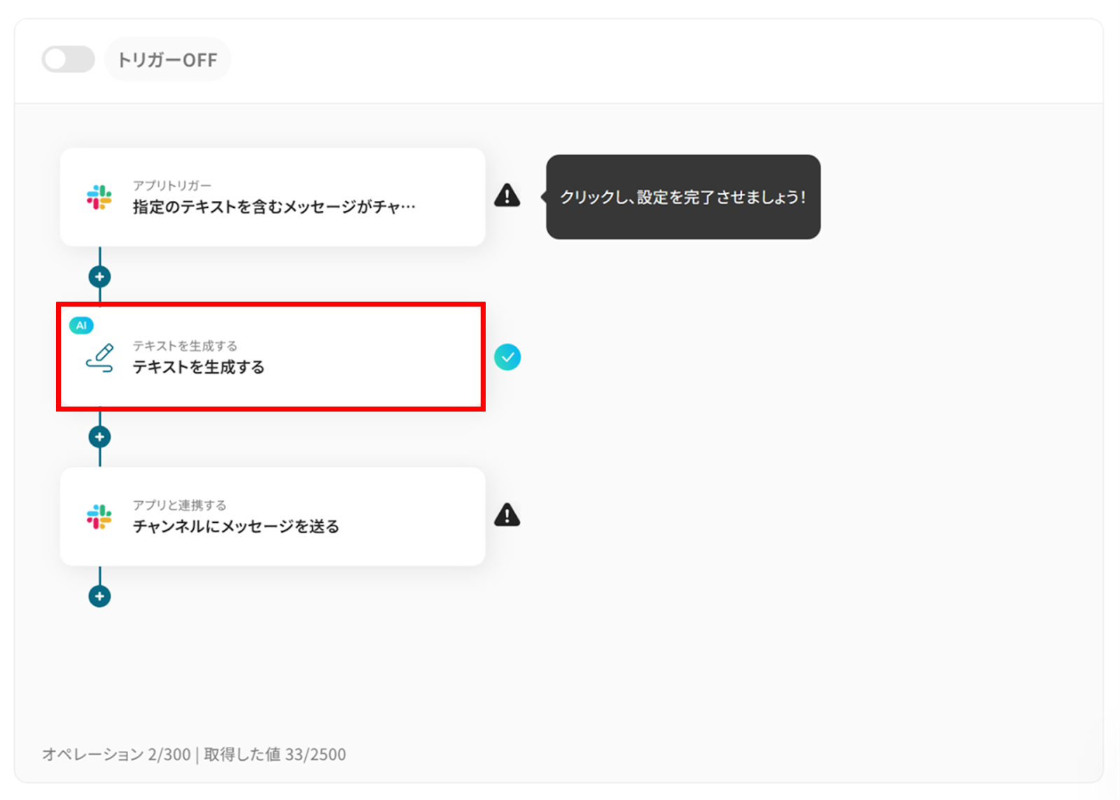 アプリトリガー、AI機能を使ってテキストを生成する、Slackのチャンネルにメッセージを送る設定