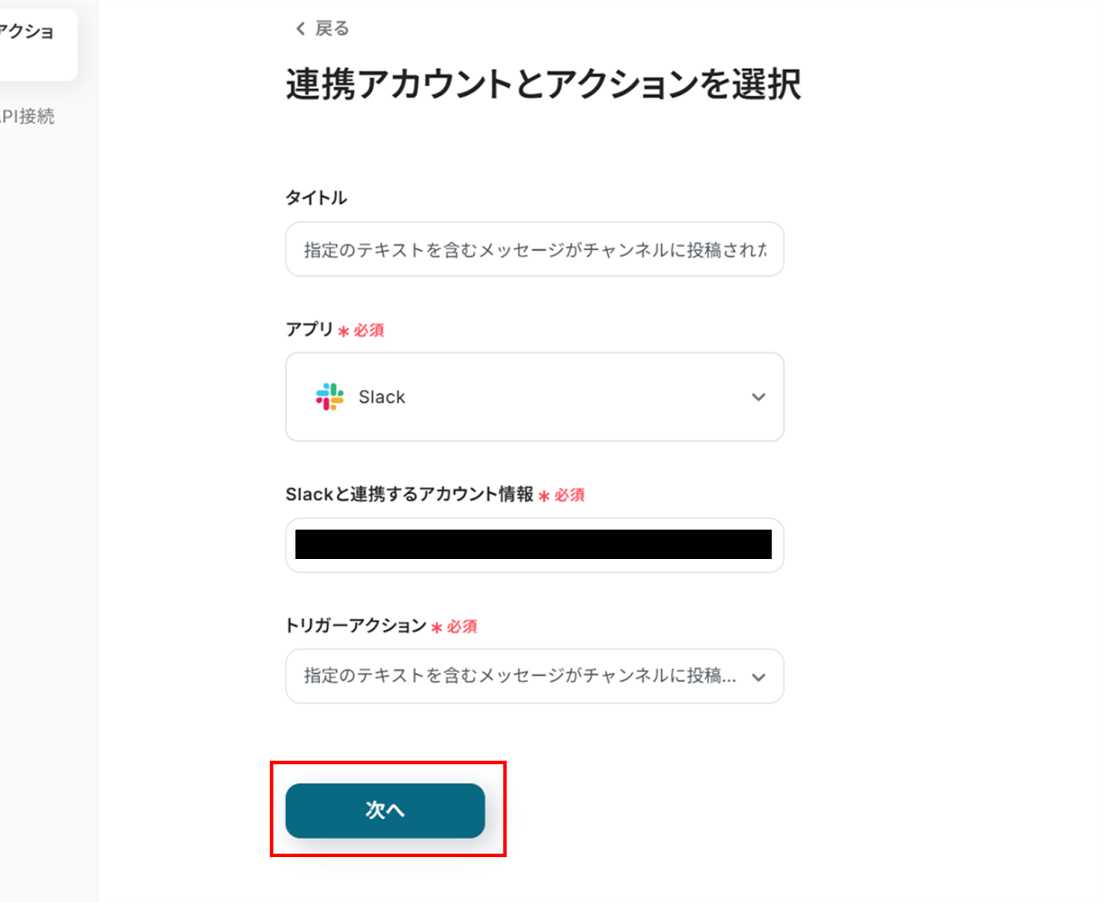 (2)Slackの「連携アカウントとアクションを選択」画面から、Slackと連携するアカウント情報に誤りがないかを確認し、トリガーアクションは「指定のテキストを含むメッセージがチャンネルに投稿されたら」のままで「次へ」をクリックします。