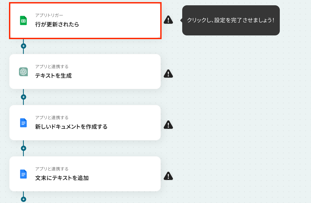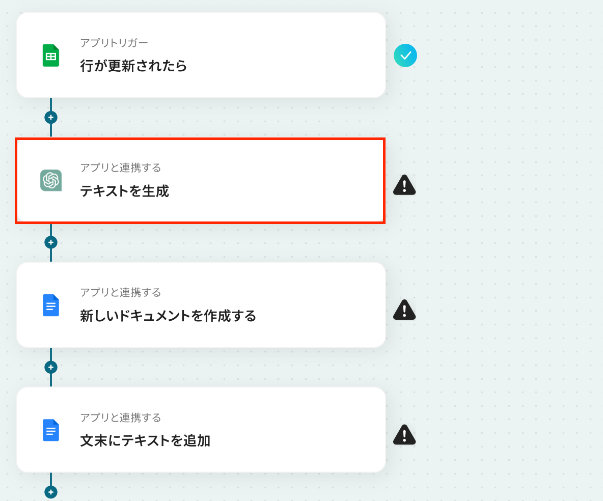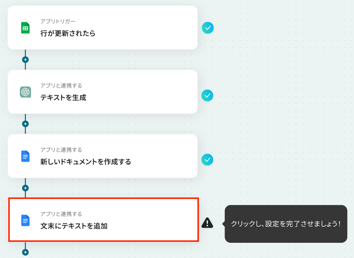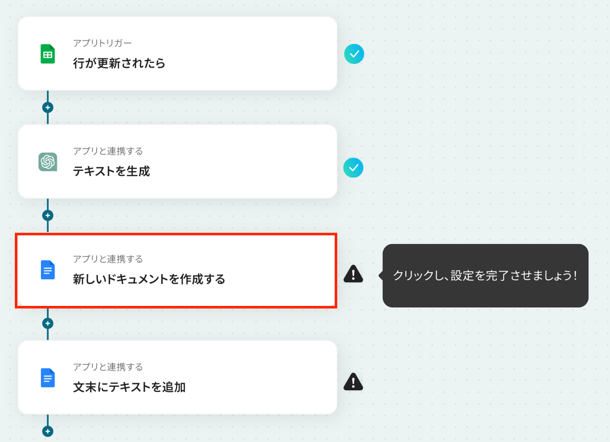 ステップ6:Googleドキュメントにテキストを追加する設定 いよいよ最後の設定です!ここでは、ChatGPTで生成した内容をGoogleドキュメントに追加する設定を行います。 以下の赤枠をクリックしましょう。