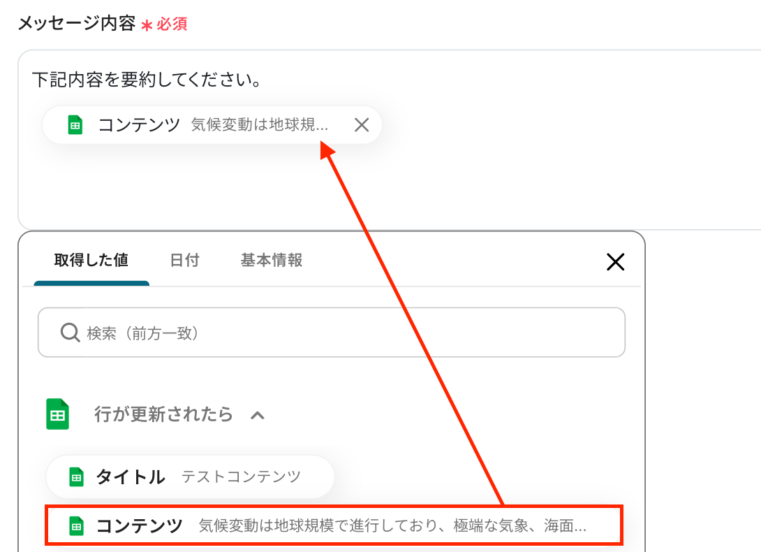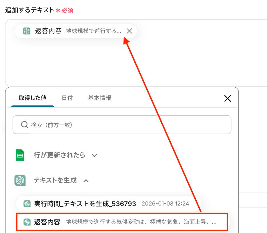 追加するテキスト :任意で作成した文章とChatGPTの設定で取得した値をを組み合わせて入力してください。