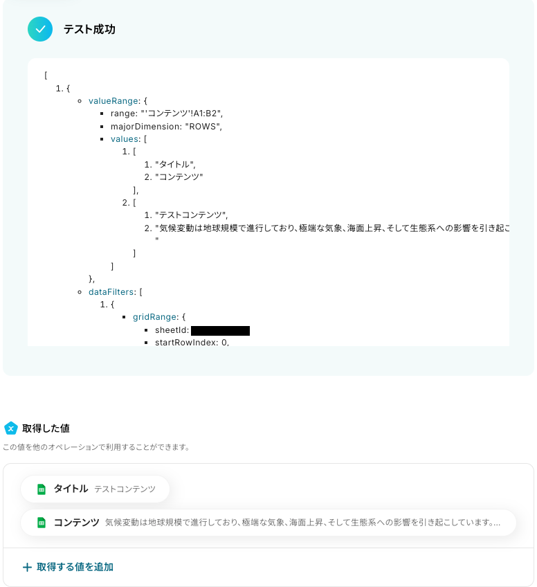 「テスト」をクリックします。 テストに成功すると、取得した値が表示されます。