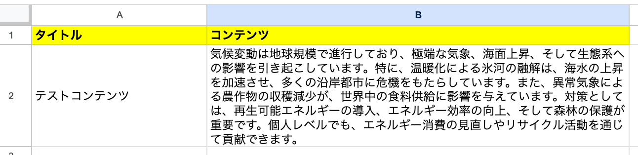 ここで、Google スプレッドシートの画面に移り、任意の行を更新します。今回は以下のシートを使用します。
