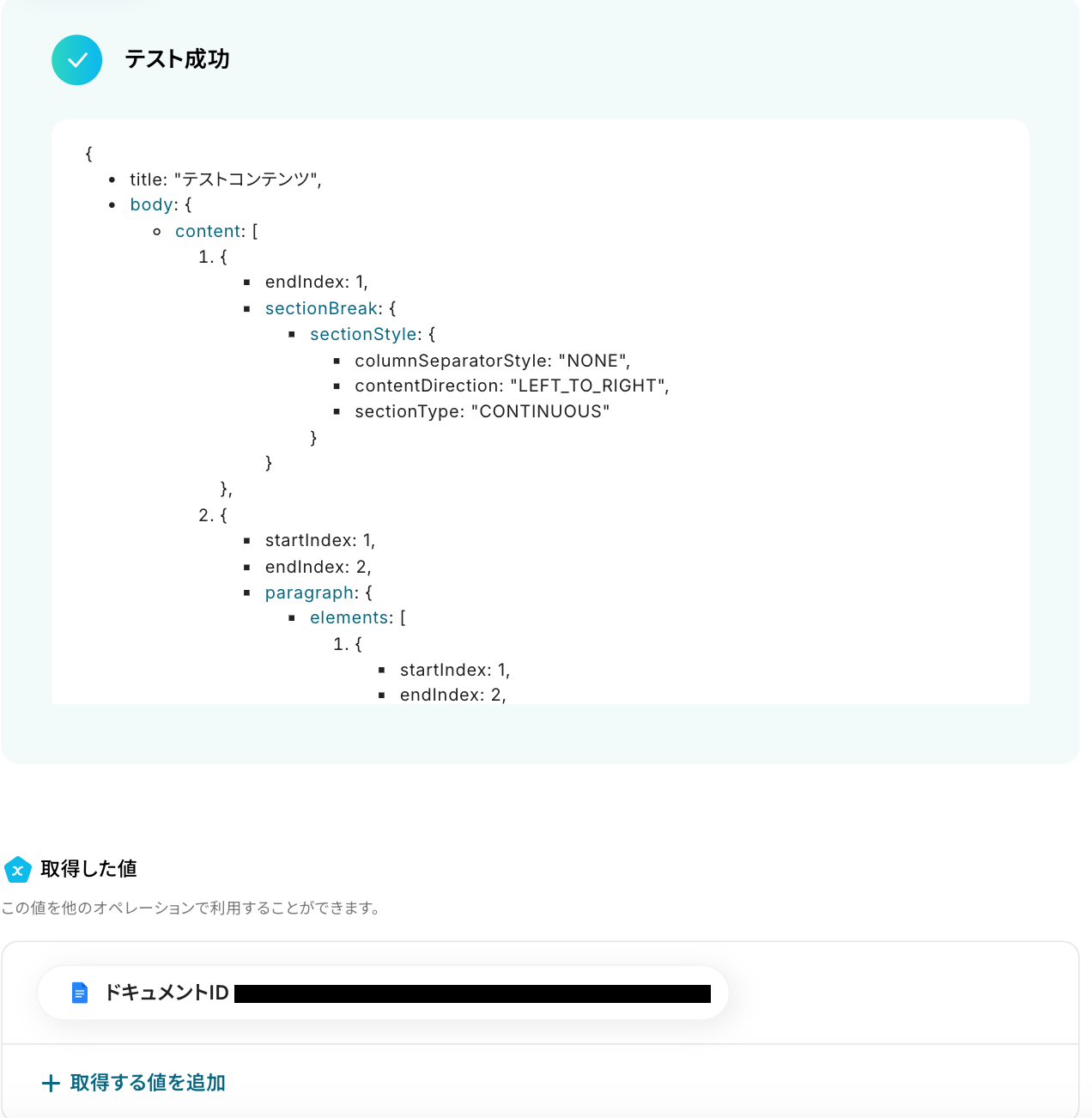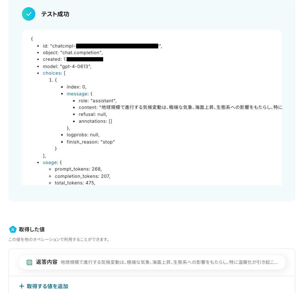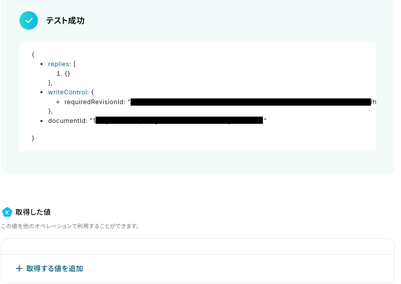 設定が完了したら、テストを行いましょう! テストに成功すると、取得した値を取得できます。※ 取得した値 とは? トリガーやオペレーション設定時に、「テスト」を実行して取得した値のことを指します。 後続のオペレーション設定時の値として利用でき、フローボットを起動する度に変動した値となります。