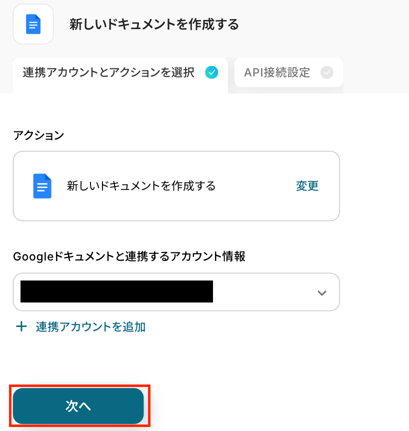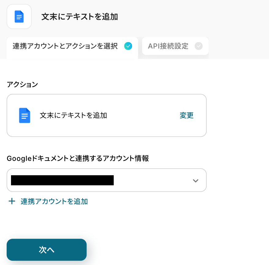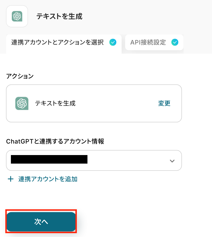 アクションはそのままで、連携するアカウント情報を確認します。 「次へ」をクリックしましょう!