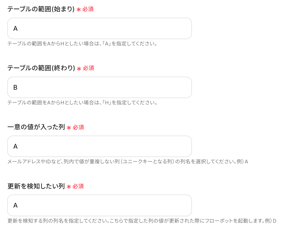 更新を検知したい列 :ここで指定した列の値が更新された際にフローボットを起動。今回はAを選択。