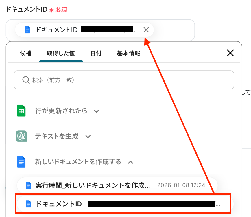 「文末にテキストを追加」オペレーションの「ドキュメントID」を設定する項目で、入力欄をクリックして表示される「候補」から選択