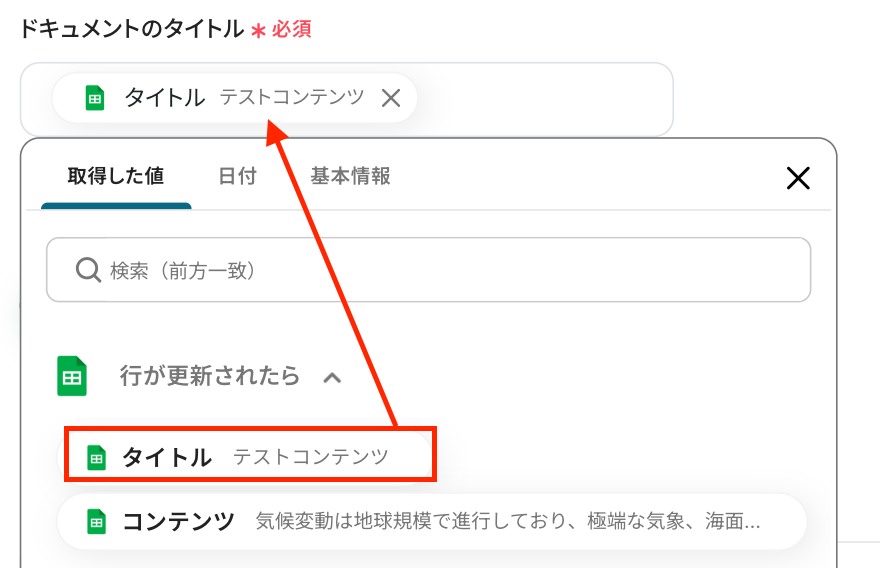 ドキュメントのタイトル :Google スプレッドシートの取得した値を設定してください。入力欄をクリックすると表示されます。