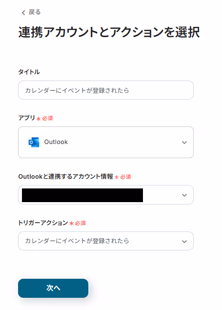 「連携アカウントとアクションを選択」画面では以下を設定します。