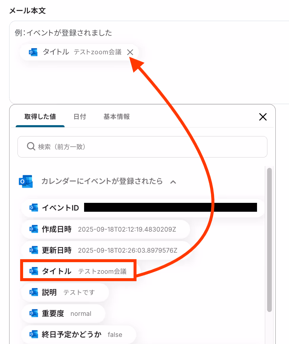 トリガーやオペレーション設定時に、「テスト」を実行して取得した値のことを指します。
