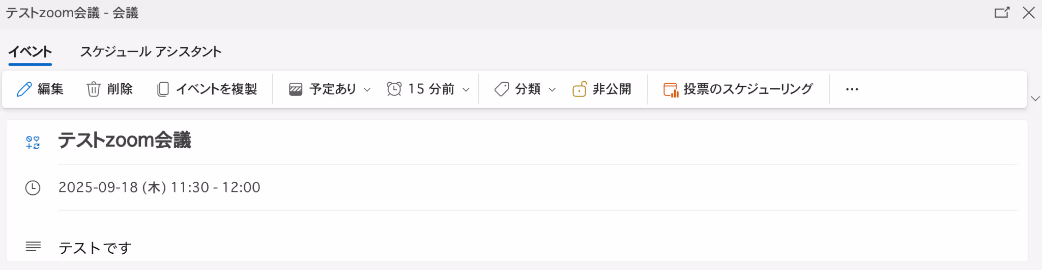 作成する予定は、架空の情報(「テスト」や「A会議室」など)でOKです。