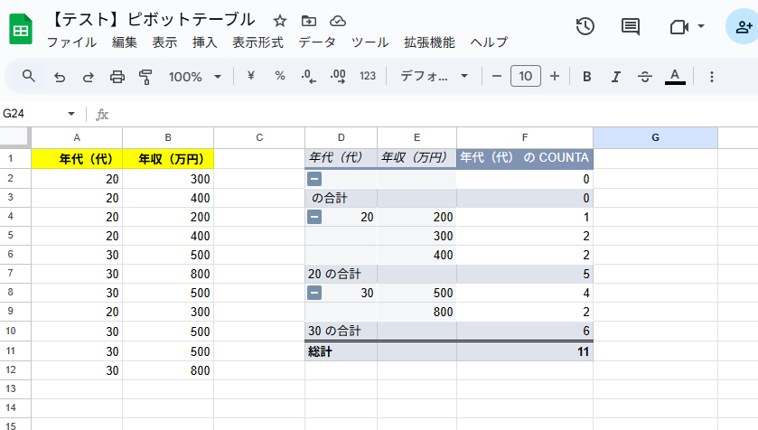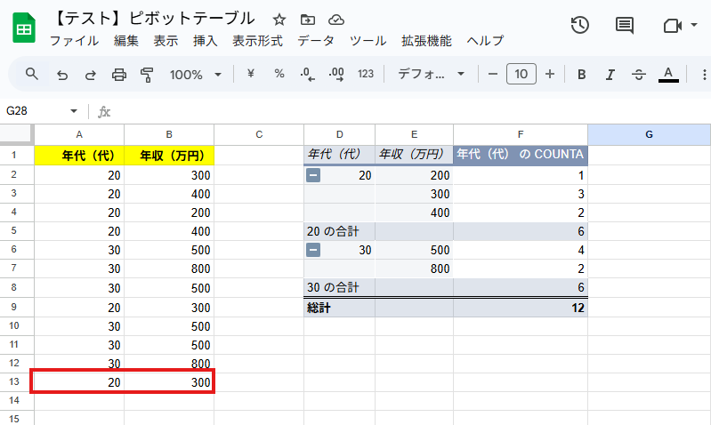 Google スプレッドシートを確認すると、先ほど取得したAirtableの値が追加され、ピボットテーブルも更新されています。