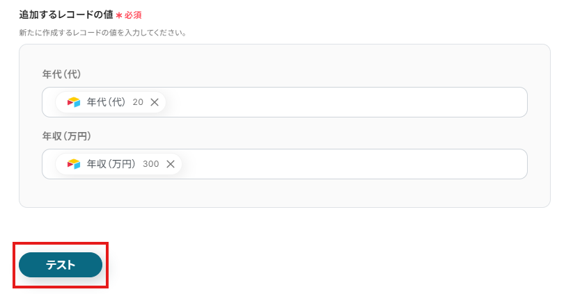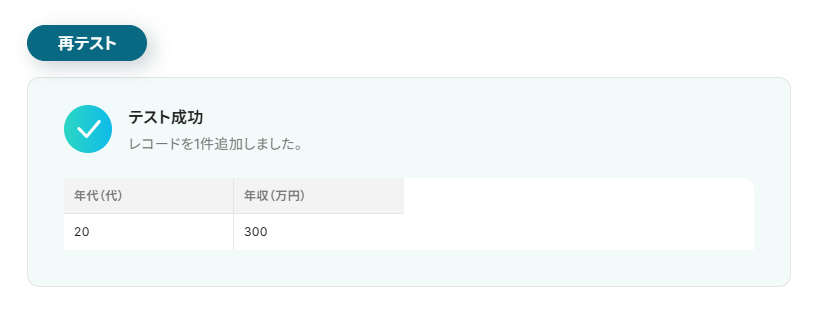 テスト成功と表示され、レコードが追加されているのをご確認ください。