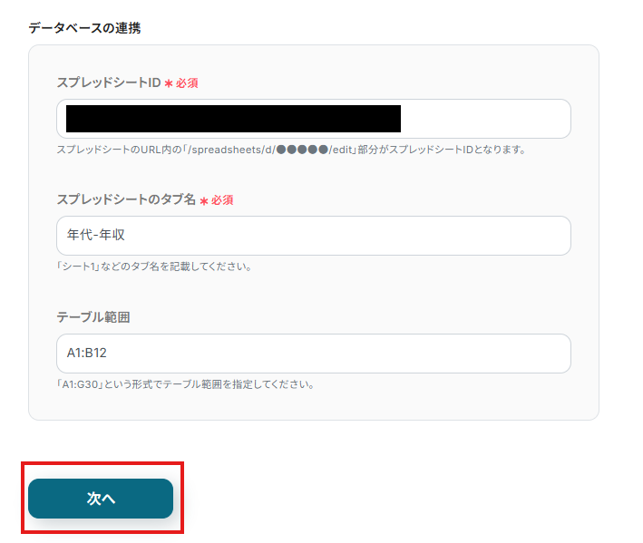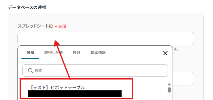 - 「スプレッドシートID」と「スプレッドシートのタブ名」:入力欄をクリックすると、プルダウンが出てくるので、連携したいものを選択します。