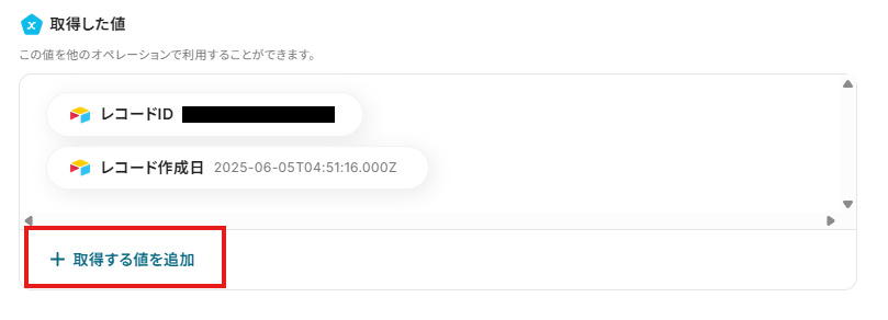 Googleスプレッドシートに追加する値を設定するため、「+取得する値を追加」をクリックしてください。