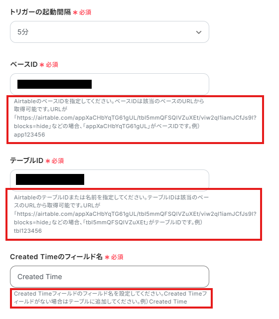 「ベースID」「テーブルID」「Created Timeのフィールド名」は、入力欄下の説明に従って、入力してください。