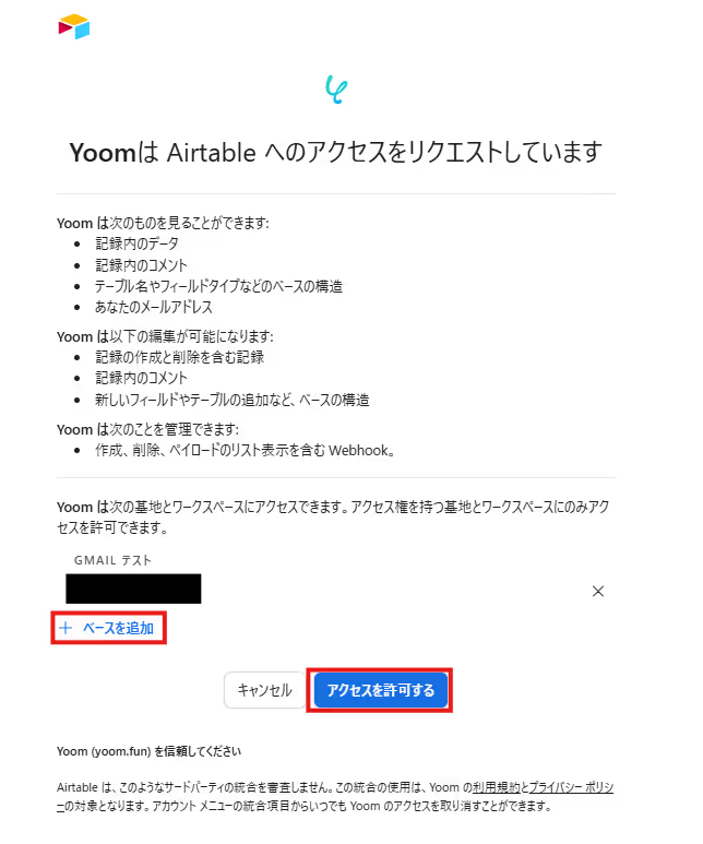 次の画面で、ベースを追加し、「アクセスを許可する」をクリックしてください。