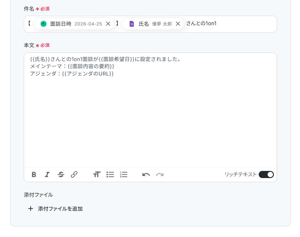 テンプレートでもマニュアルは設定されていますが、アジェンダの構成や面談予定日の調整方法などを運用に合わせて変更する必要があります。
