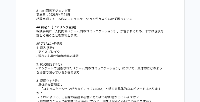 これにより、「目標達成率は現在80%ですが、本人の悩みとしては新規開拓に課題を感じているようです。このギャップについて深掘りしましょう」といった、データに基づいたより具体的で鋭い視点を持つアジェンダが自動生成されます。