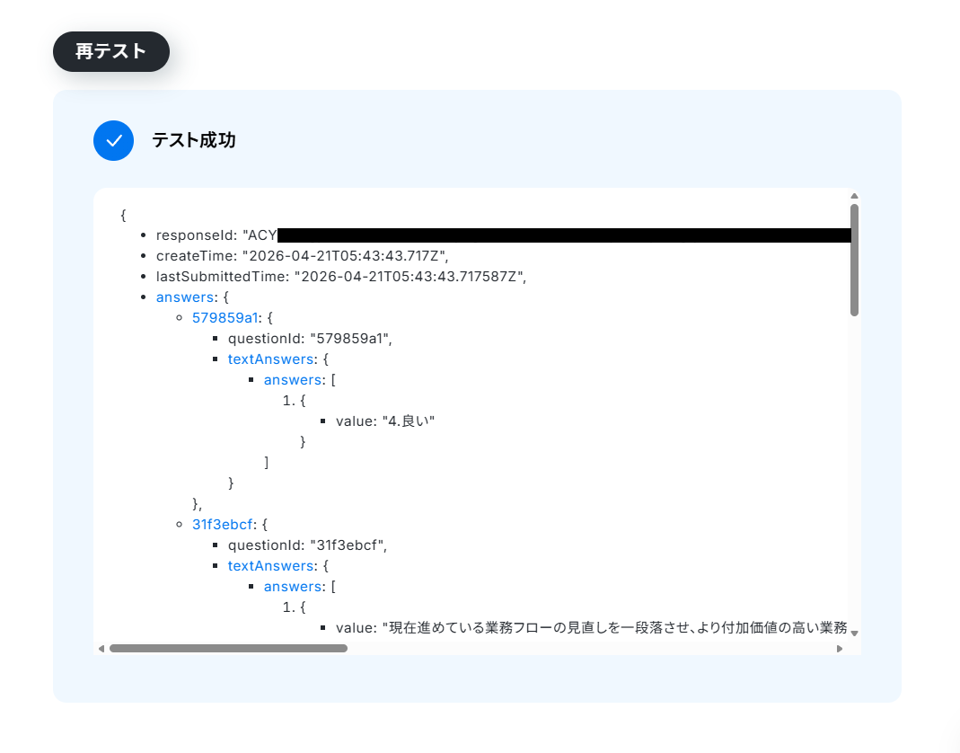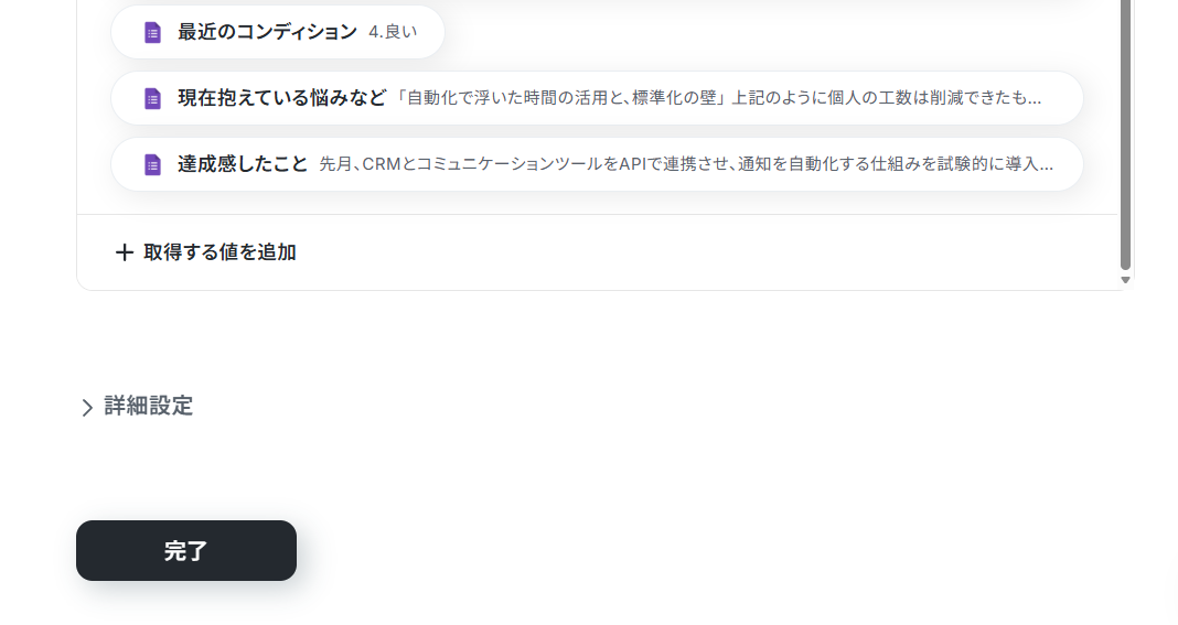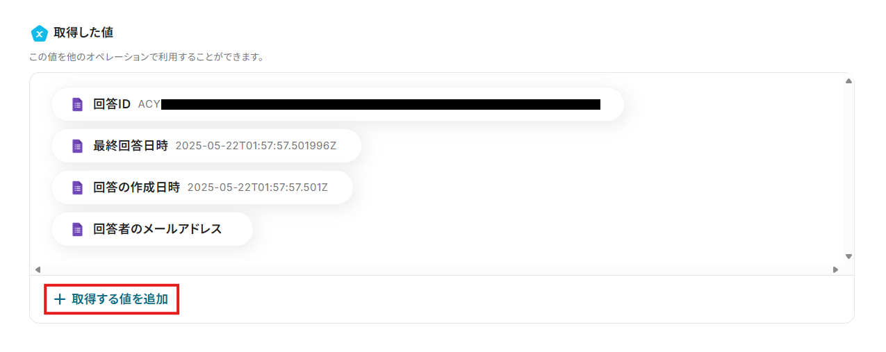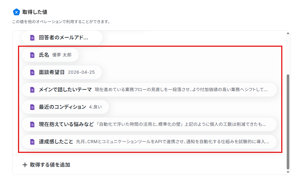 これらの値は、以降のアクションで変数として使用できるようになります。