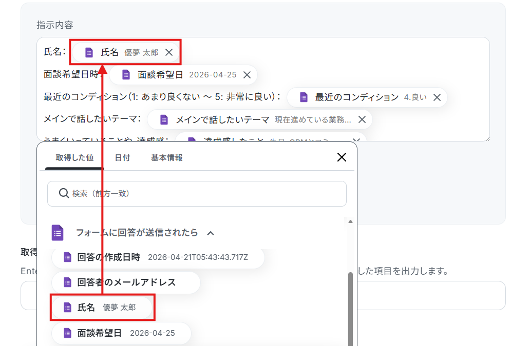 項目をクリックすると、入力欄に{{項目名 取得した値}}という形で追加されます。