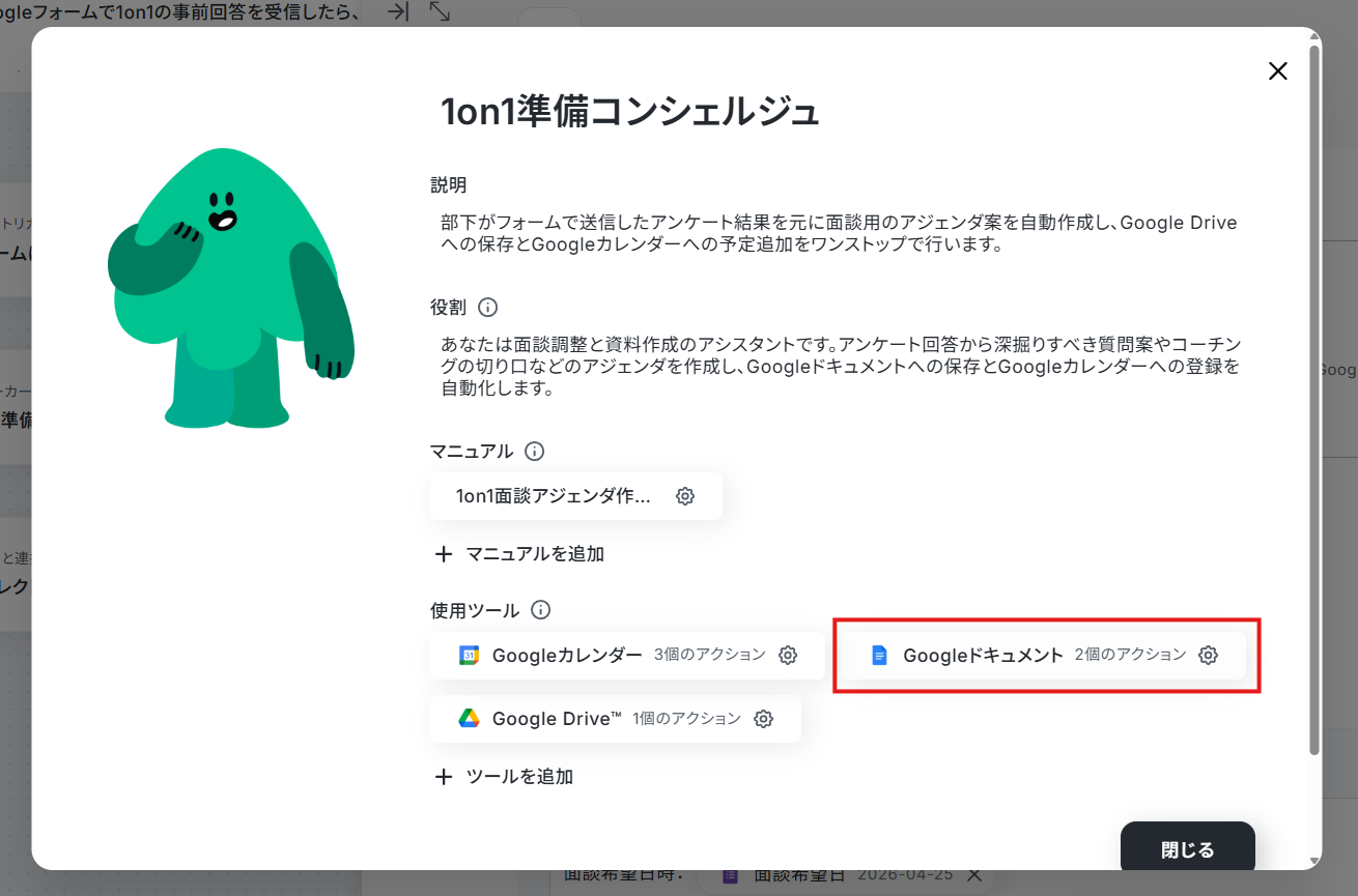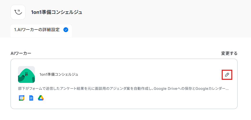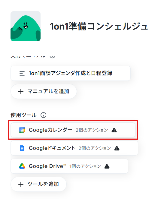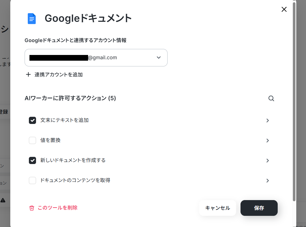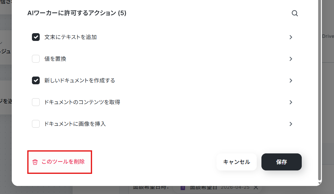1. 「AIワーカーオペレーション」の設定画面を開いて、Googleドキュメントを使用ツールから削除します。