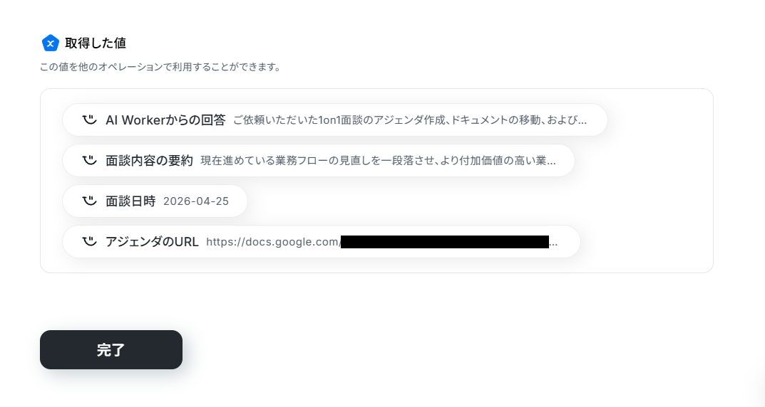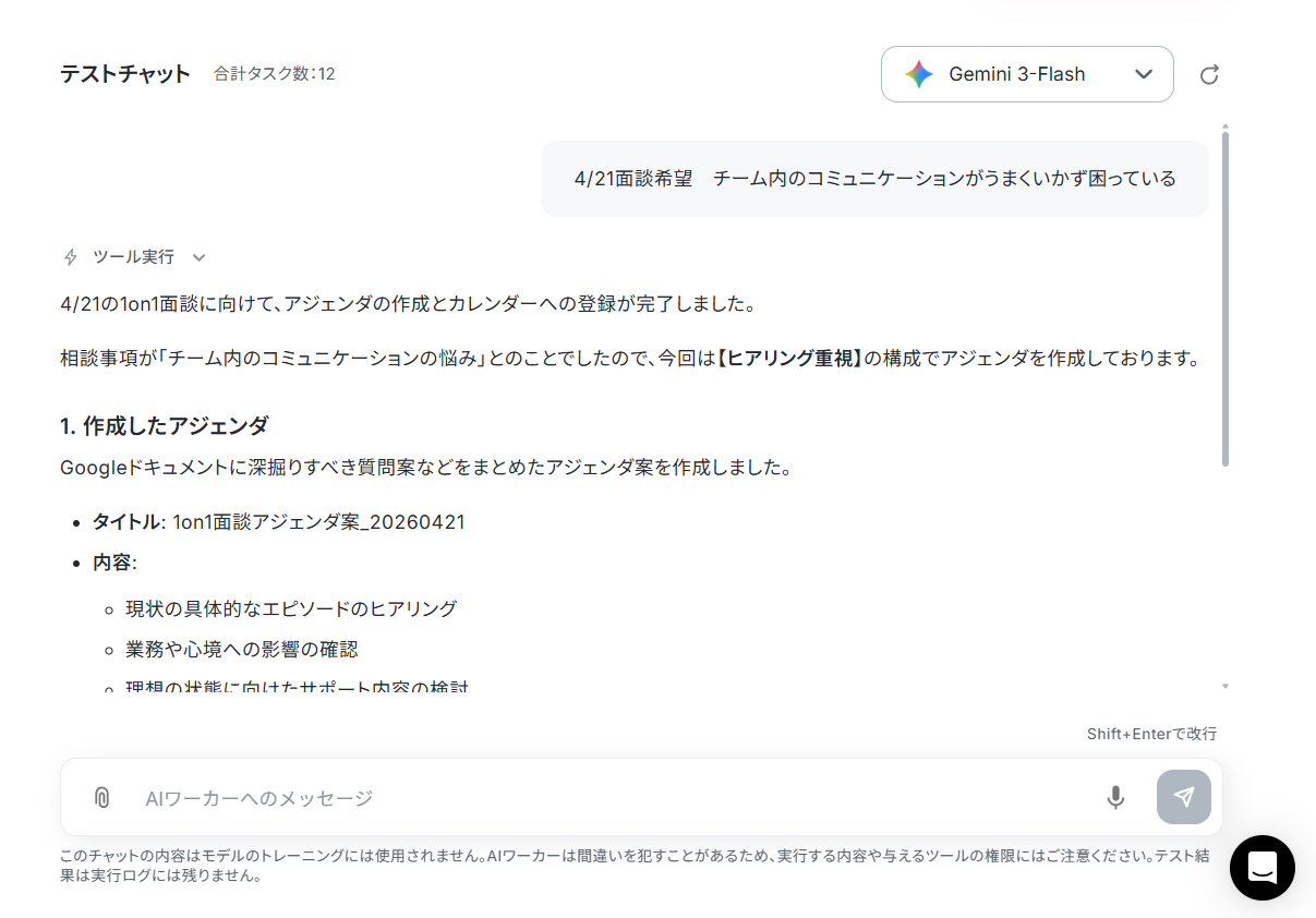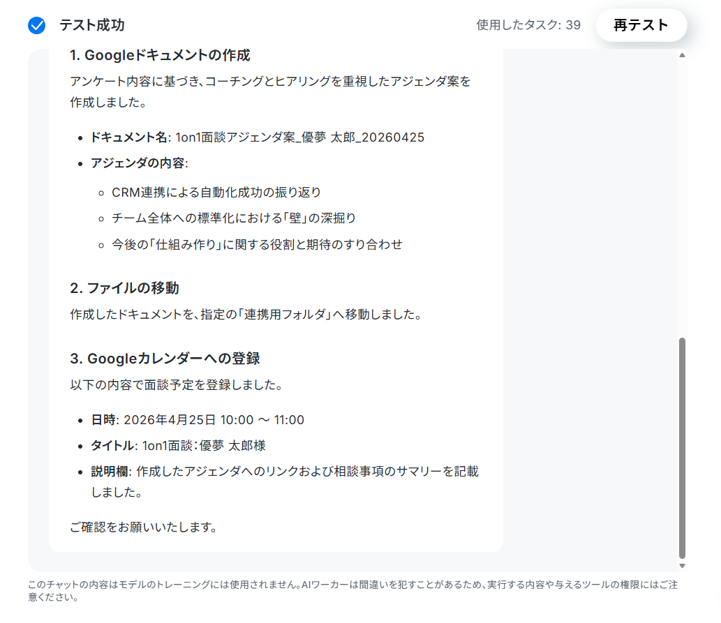 AIワーカーから結果が返ってきて、Google Driveにアジェンダが作成され、Googleカレンダーに予定が作成されていればテスト成功です。これでAIワーカーの設定が完了しました!