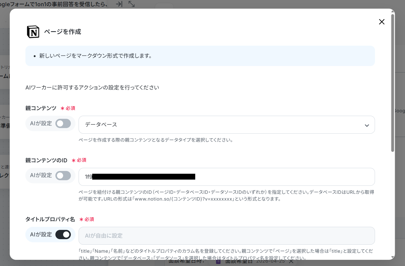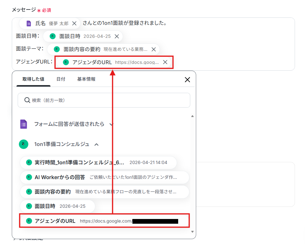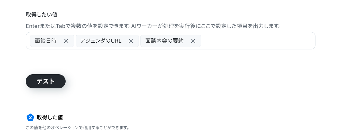 トリガーアクションで取得した値も、ここでAIワーカーに渡していきます。