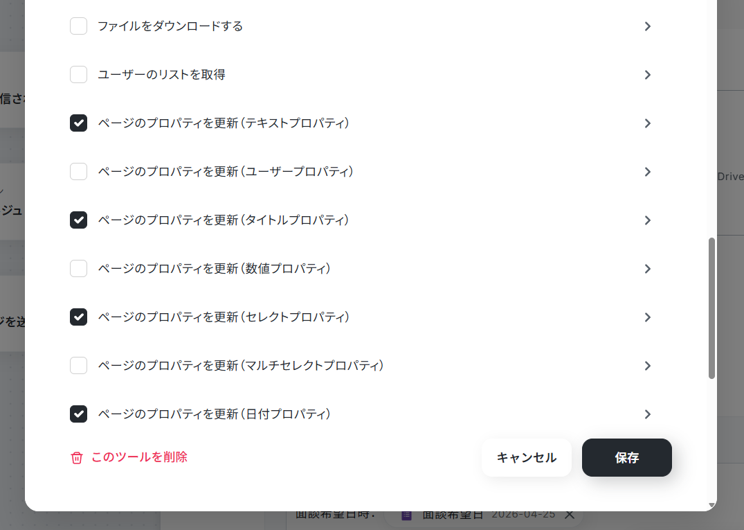 3. 「ページを作成」と必要な「ページのプロパティを更新」のアクションにチェックを入れます。