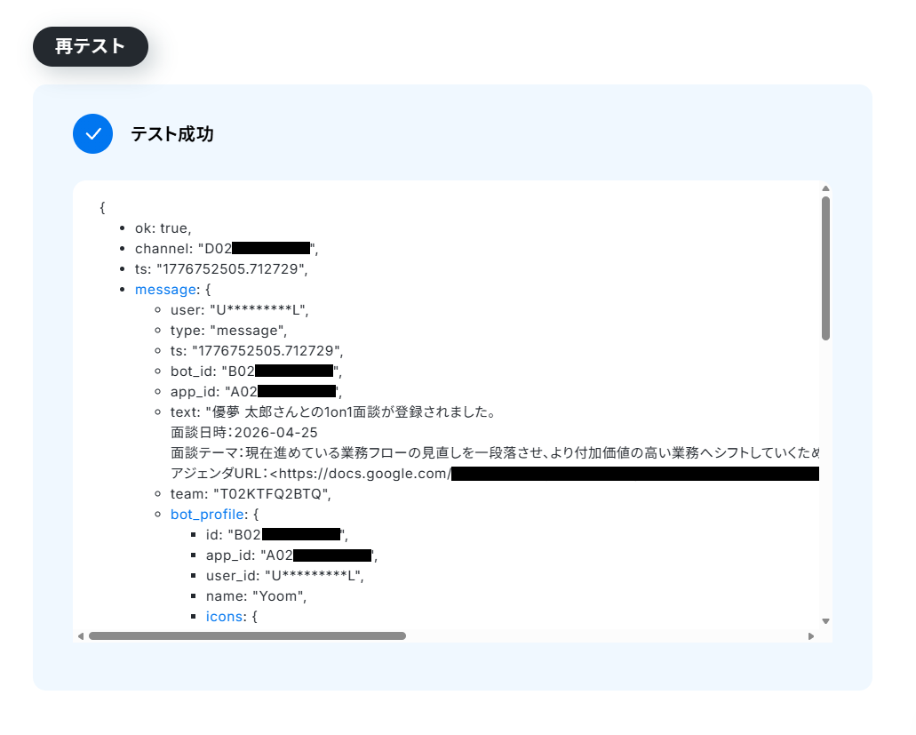 7. 以下のような結果が出力され、アジェンダの作成から予定の登録までが実行されていればテストは成功です!