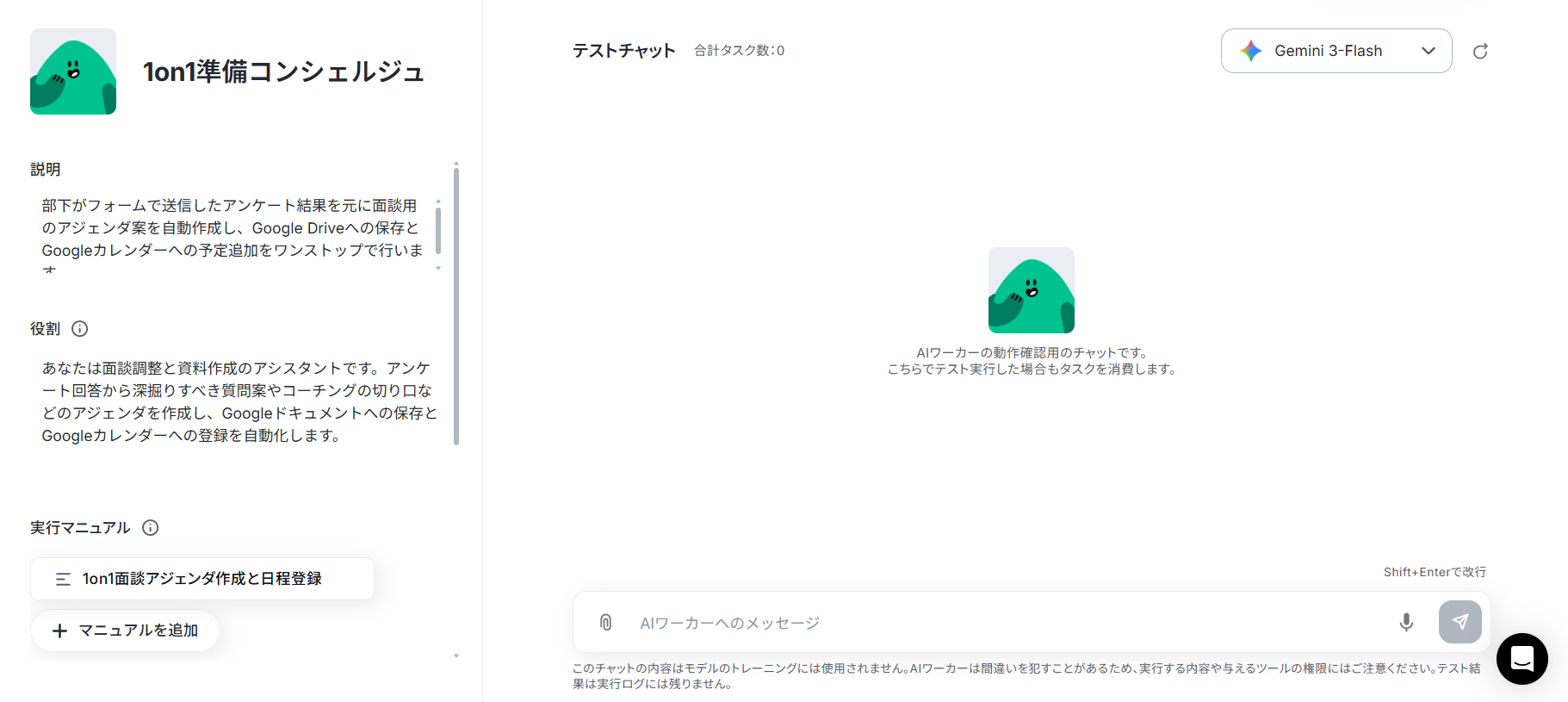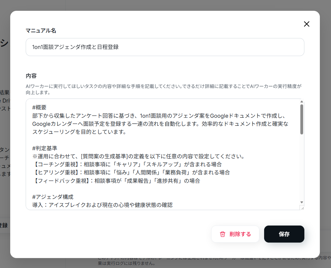 マニュアルはAIワーカーが役割に設定された仕事をこなすための手順書です。