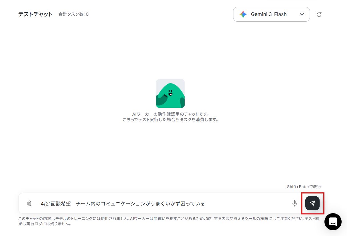 ※ AIワーカー設定時のテストでチャットに送信したような内容をイメージしてください。