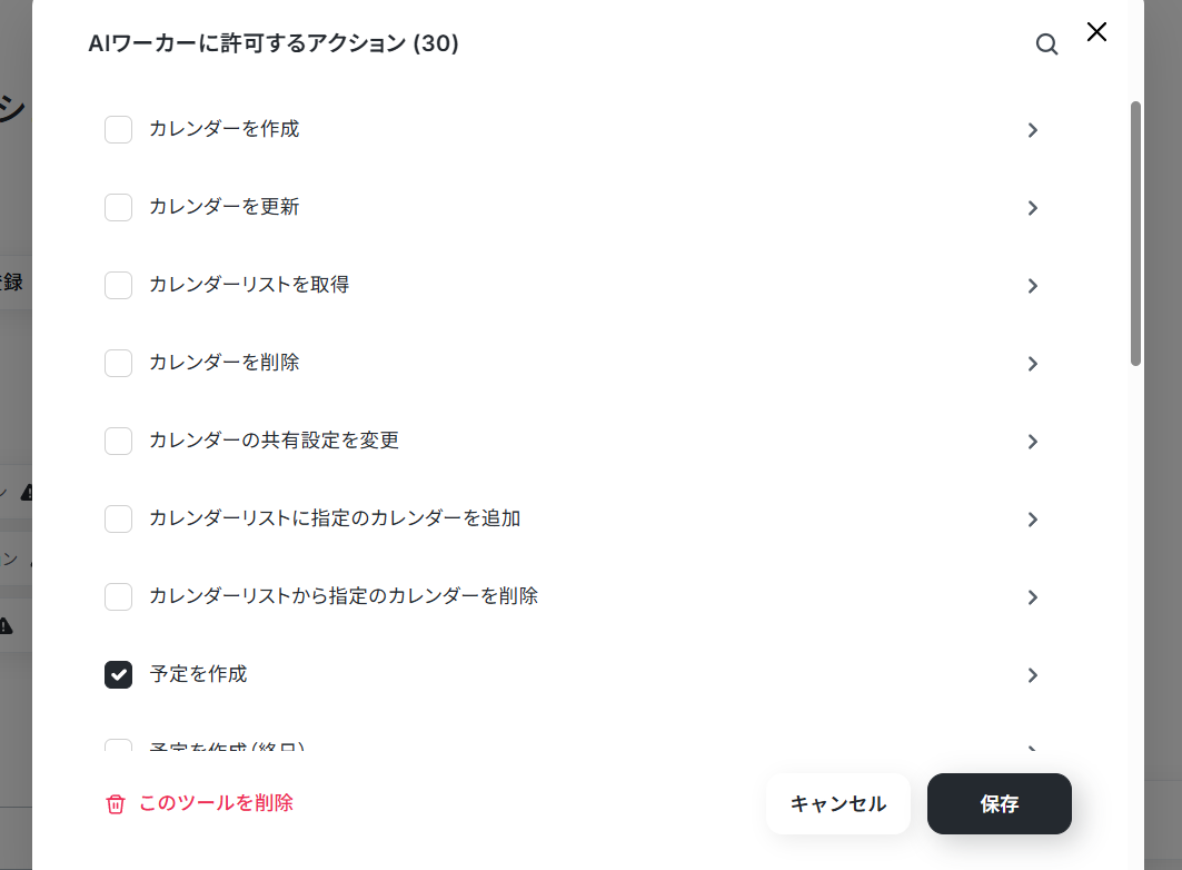 デフォルトで「予定の作成」にチェックが入っているので、アクション名をクリックして詳細を確認してください。