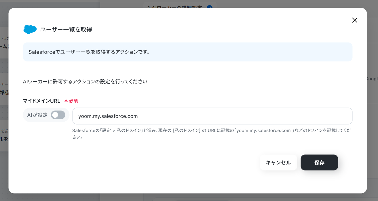 そんな時は、AIワーカーの使用ツールにSalesforceの「ユーザーオブジェクトのレコードを取得」アクションなどを追加してみましょう。