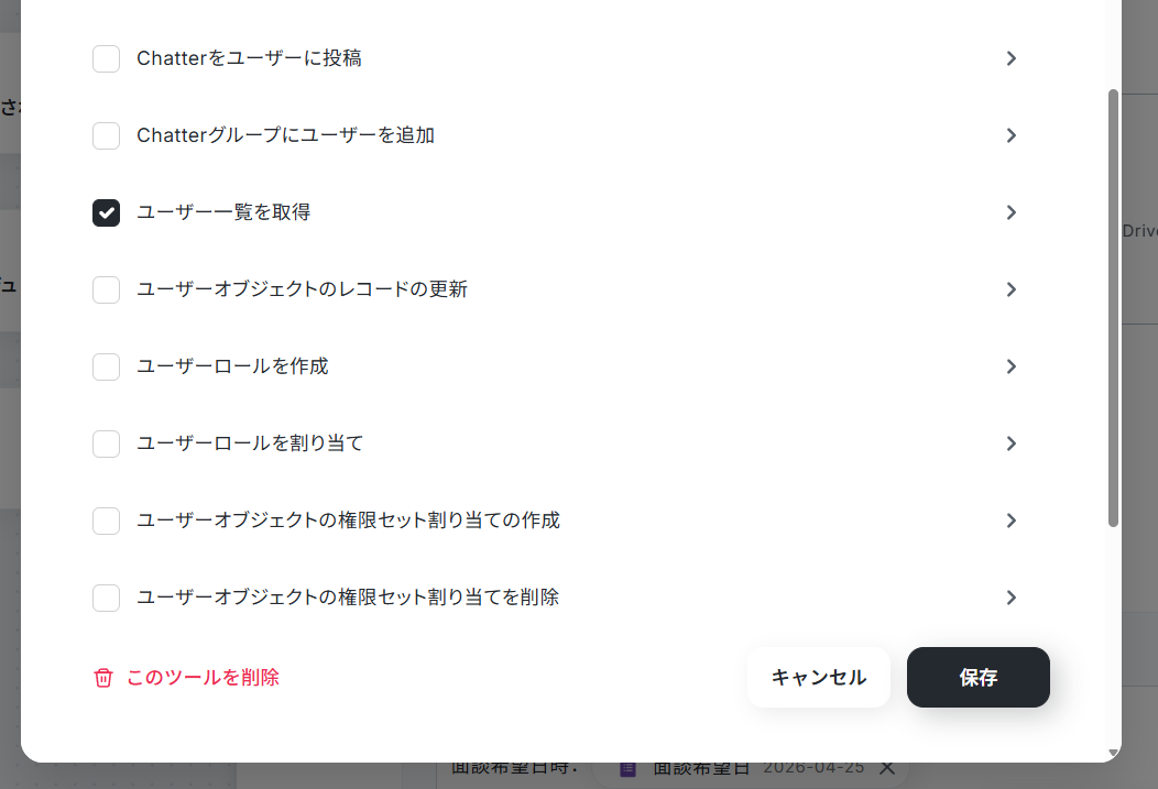 1. 「AIワーカーオペレーション」の設定画面を開いて、Salesforceを使用ツールに追加。
