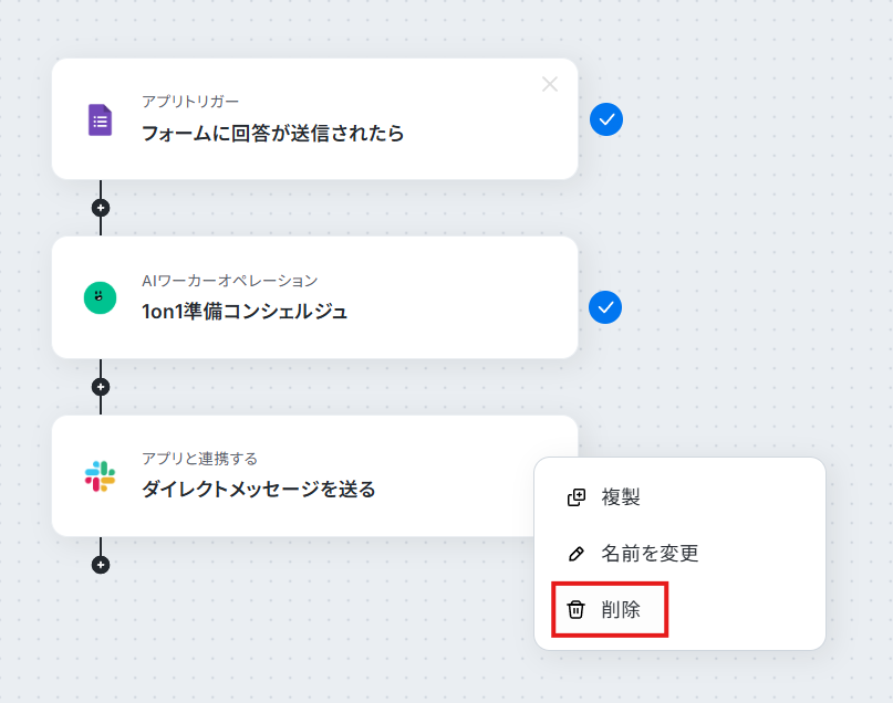 1. Slackの「ダイレクトメッセージを送る」アクションの右上のメニューから「削除」を選択します。