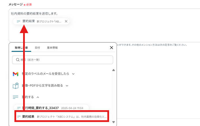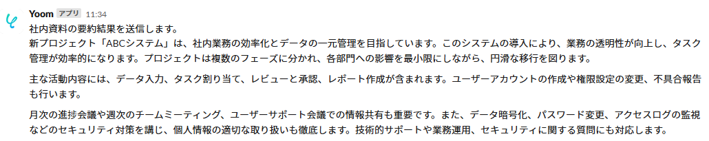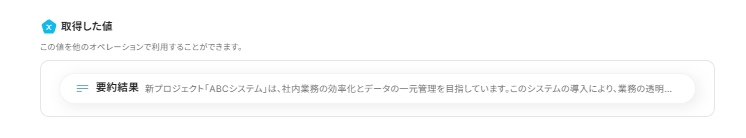 今回は社内資料を要約したことと、要約内容を設定しました。
