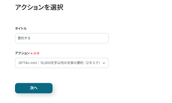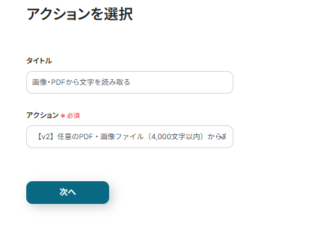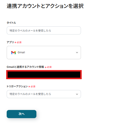 連携アカウントとアクションを選択する画面が表示されるので、今回連携するGmailのアカウントか確認し、「次へ」をクリックしましょう。